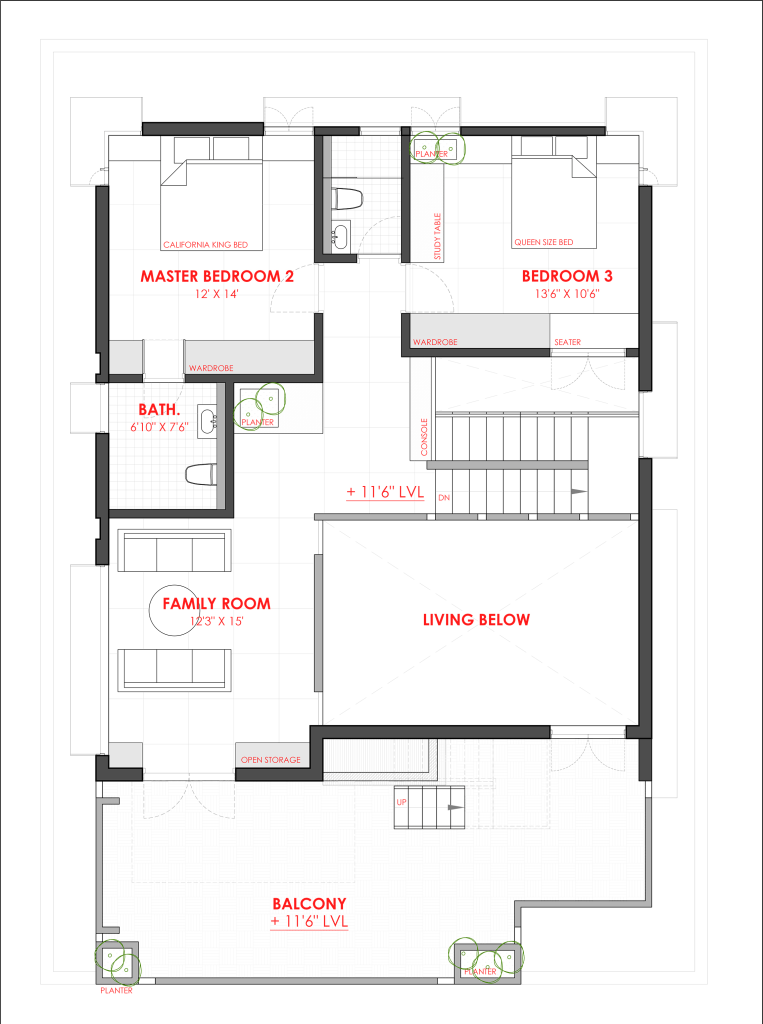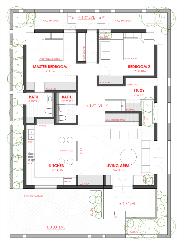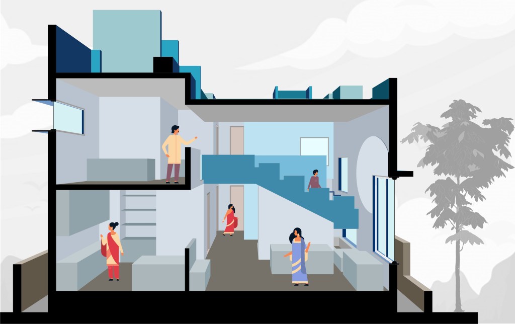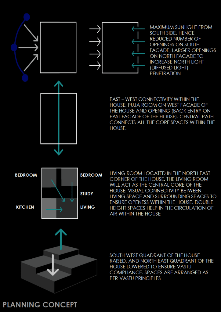 This four-bedroom house for a family of five was designed with optimization and adherence to Vastu principles in mind. The layout maximizes the use of space, with open and connected public areas and private spaces tucked in the back. Cross ventilation and strategically placed windows are also incorporated to improve air flow. The terrace features stepped slabs which create a sense of hierarchy within the rooms and align with Vastu guidelines.